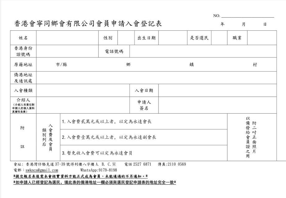 有兴趣之会员可填写以上入会申请表,并电邮至 swknca@gmail.com / 传真至 +852 21100569